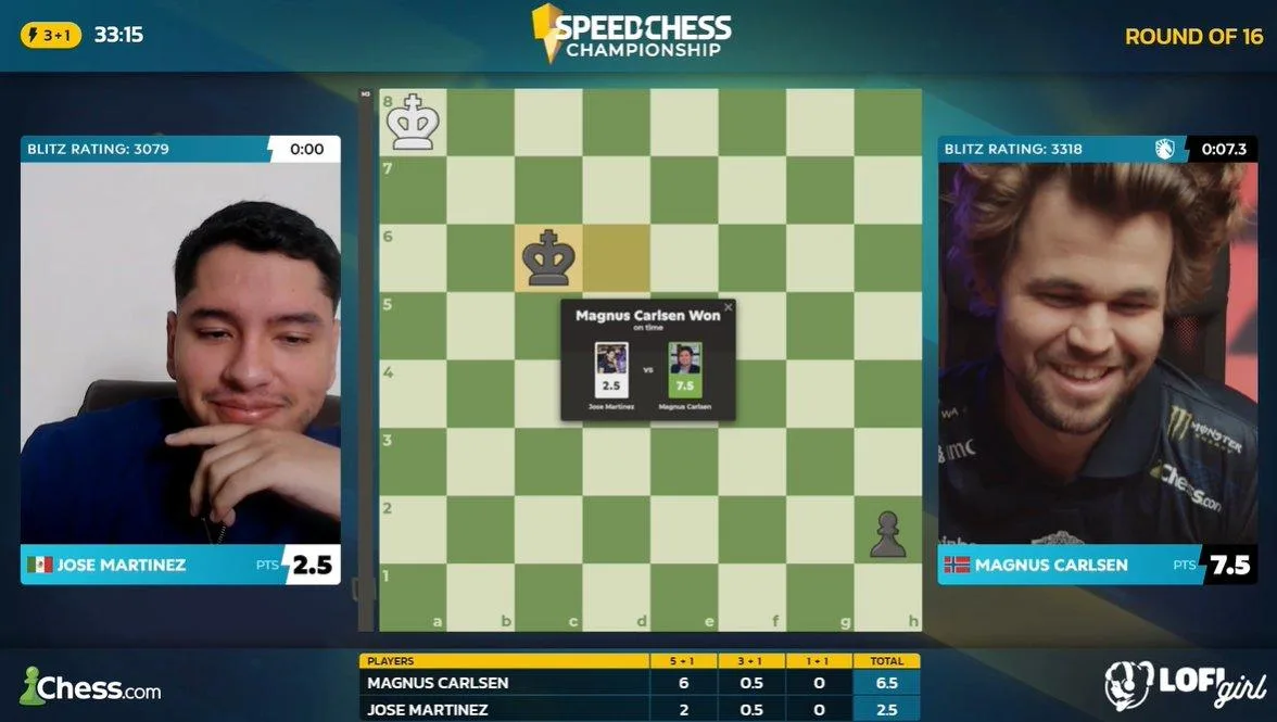 - مگنوس کارلسن با نتیجه 14.5-8.5 استاد بزرگ خوزه مارتینز (Jose Martinez) را مغلوب کرد