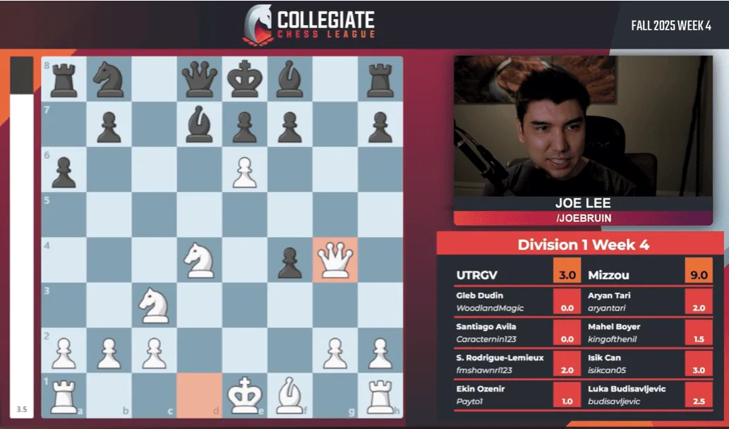 مسابقات شطرنج کالج‌ها (Collegiate Chess League) در هفته چهارم شاهد یک دیدار کلیدی بود که در آن تیم دانشگاه میزوری کلمبیا (Mizzou) با پیروزی قاطع ۱۲-۴ مقابل دانشگاه تگزاس ریو گراند ولی (UTRGV)، جایگاه خود را در صدر جدول مسابقات تثبیت کرد.