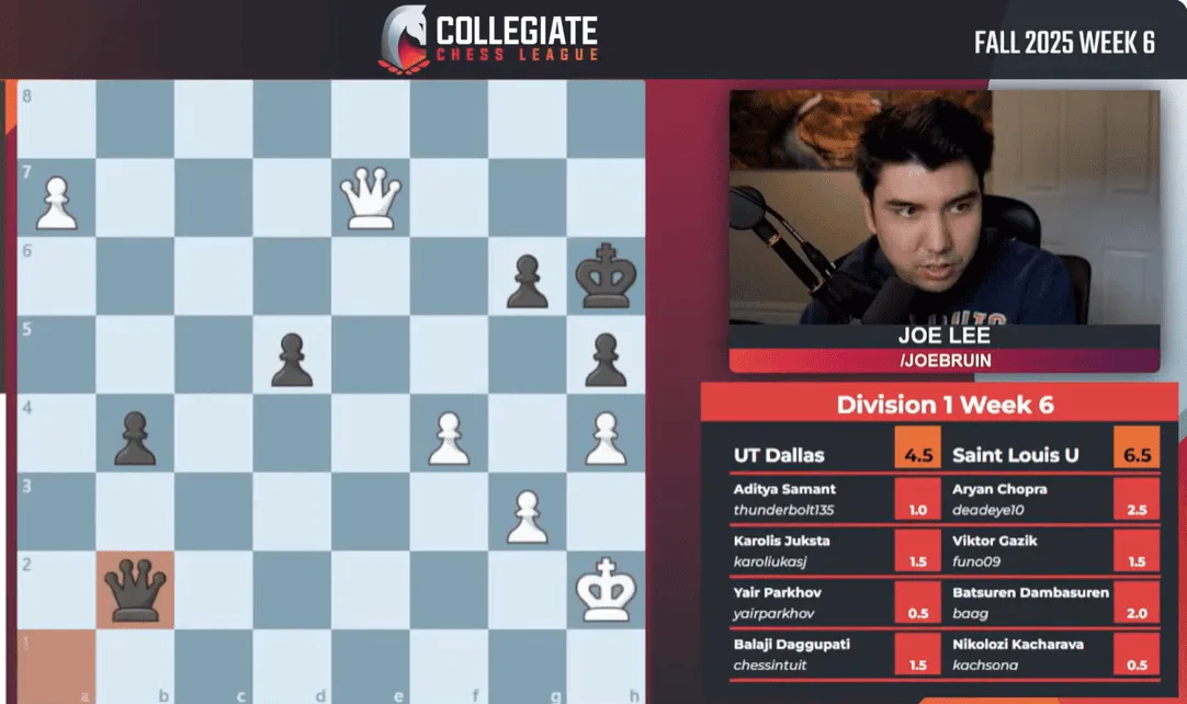 در یک رویداد چشمگیر در مسابقات شطرنج لیگ کالج‌ها (Collegiate Chess League)، دانشگاه تگزاس دالاس (University of Texas, Dallas) با کسب پیروزی ارزشمند 8.5-7.5 مقابل سنت لوئیس یونیورسیتی (Saint Louis University) که قهرمان دفاعی این رقابت‌ها محسوب می‌شد، به صدر جدول رده‌بندی صعود کرد.