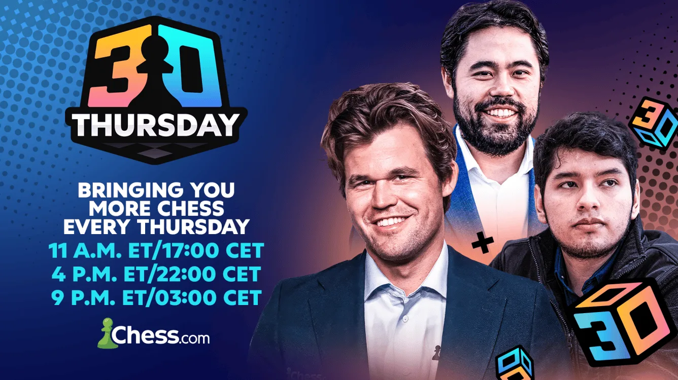 چس‌دات‌کام (Chess.com) رویداد جدید هفتگی 3 0 Thursday را با جوایز ۳۰۰۰ دلاری برای شطرنج‌بازان دارای عنوان معرفی کرد. این مسابقات شطرنج با کنترل زمان ۳+۰ در سه نوبت مختلف هر پنجشنبه برگزار می‌شود.