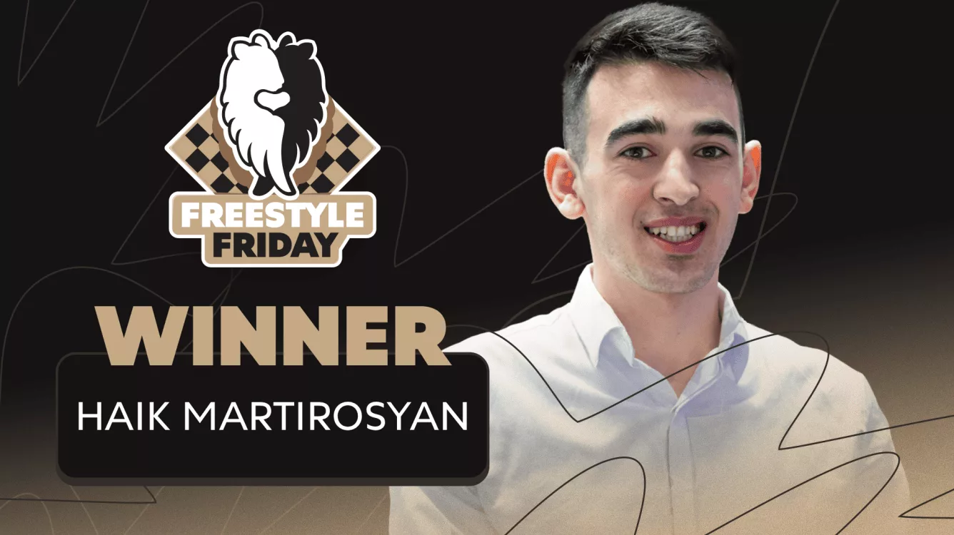 استادبزرگ هایک مارتیروسیان (Haik Martirosyan) با نمایشی چشمگیر در مسابقات شطرنج آنلاین فرایاستایل جمعه (Freestyle Friday) که در تاریخ 13 فوریه 2026 (24 بهمن 1404) برگزار شد، اولین قهرمانی خود را در این رویداد به ثبت رساند. مارتیروسیان با کسب 10.5 امتیاز، بهترین عملکرد از ماه ژوئیه سال گذشته را در این مسابقات شطرنج آنلاین ارائه داد و با اختلاف دو امتیاز کامل از رقبا پیروز شد.
