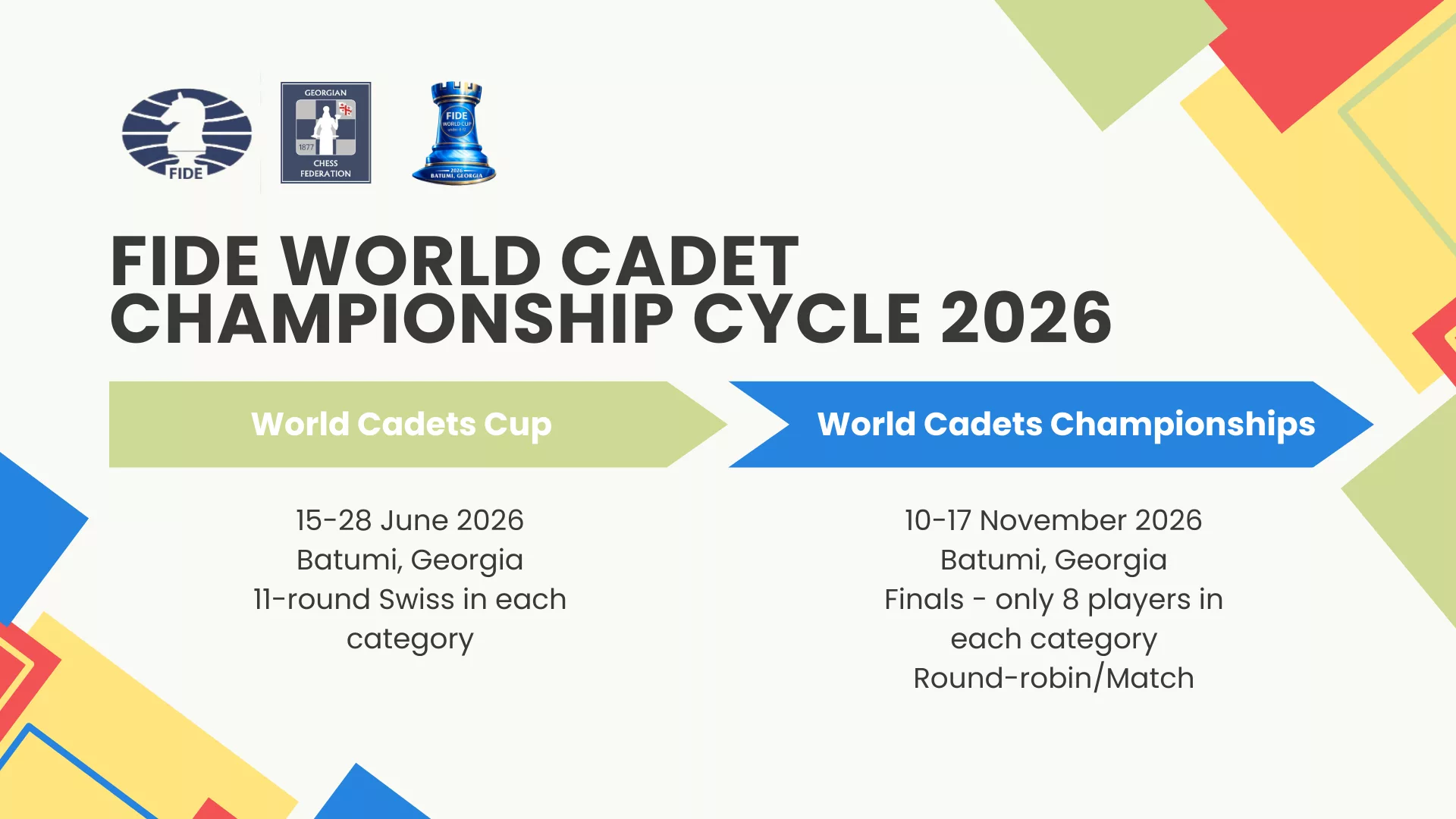 فیده (FIDE) از سال ۲۰۲۶ چرخه جدید و هیجانانگیزی برای مسابقات قهرمانی جهان در ردههای سنی زیر ۸، زیر ۱۰ و زیر ۱۲ سال معرفی میکند. این چرخه جدید مسابقات شطرنج کودکان شامل جام جهانی کودکان به عنوان مرحله مقدماتی و مسابقات قهرمانی جهان کودکان به عنوان مرحله نهایی خواهد بود.